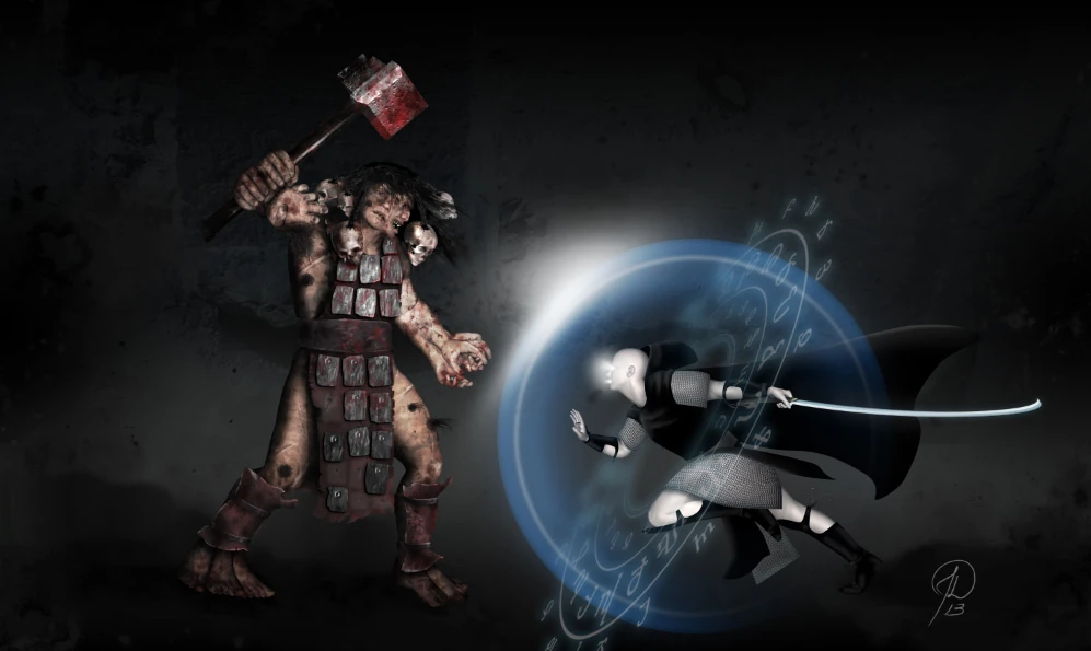 A sorcerous Nonman battling a hideous Bashrag.